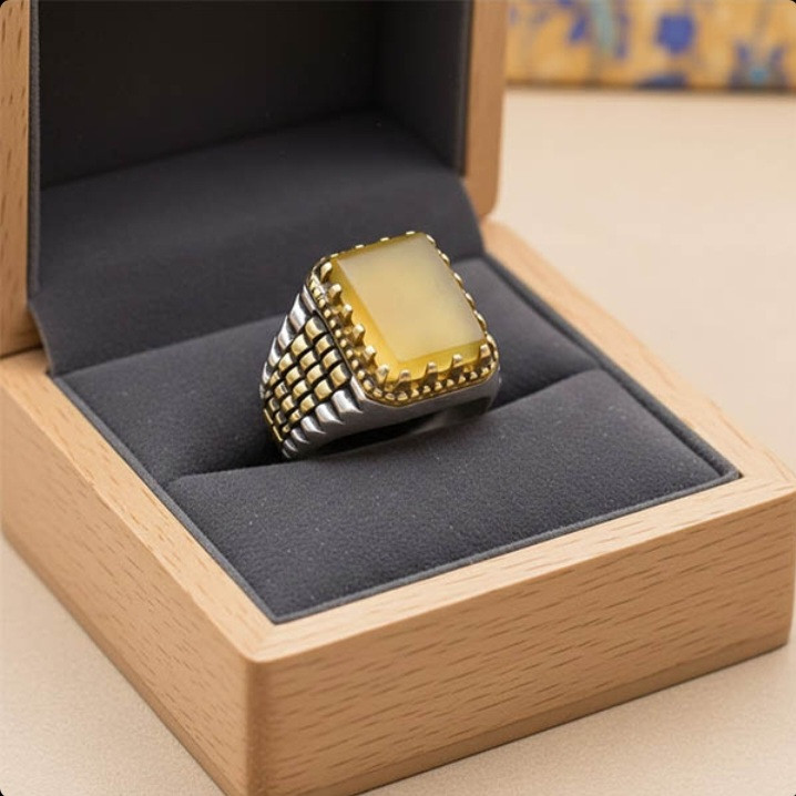 این انگشتر ترکیبی از شیک پوشی، هنر ایرانی انگشترسازان مشهدی و سبک زندگی اسلامی است. انگشتر نقره مردانه طرح رولکسی یونا از نقره عیار ۹۲۵ است و قابلیت سایز شدن برای هر سایز انگشتی را دارا می باشد. طراحی رکاب این انگشتر از ساعت رولکس الهام گرفته شده و نگین انگشتر نیز از عقیق زرد اصل و بسیار پر فضیلت شرف الشمس می باشد (حکاکی ذکر پر فضیلت شرف شمس در پشت نگین زرد با آداب و در زمان مخصوص).