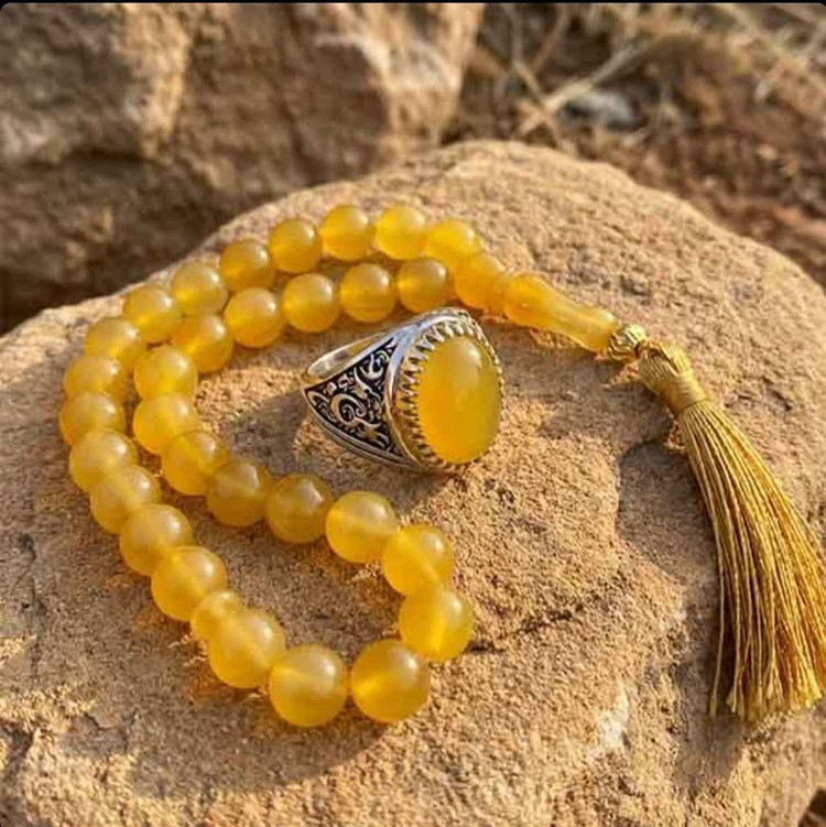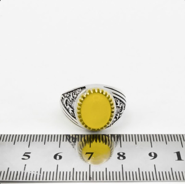طرح برجسته یا علی (ع) مدد موجود بر بازو های این رکاب زیبایی، خاص بودن و ارزش معنوی به این انگشتر بخشیده است. طرح یا علی مدد با سیاه قلمی که دارد برجستگی مناسبی به نقش و نگار آن داده است. چنگ های طلایی رنگ این انگشتر از جنس برنج بوده و با گذشت زمان هرگز تغییر رنگ نمی دهد و مانع شرعی نیز برای استفاده آقایان ندارد. نگین این انگشتر عقیق زرد اصل و معدنی بوده و دارای کیفیت بسیار بالایی است. جنس انگشتر نیز از نقره با عیار ۹۲۵ بوده و قابلیت سایز شدن برای هر سایز انگشتی را دارد. قیمت مناسب، طراحی برجسته رکاب و اصالت سنگ شرف الشمس معدنی ویژگی های اصلی این محصول می باشند (حکاکی پر فضیلت شرف الشمس در زمان مقرر با رعایت آداب).