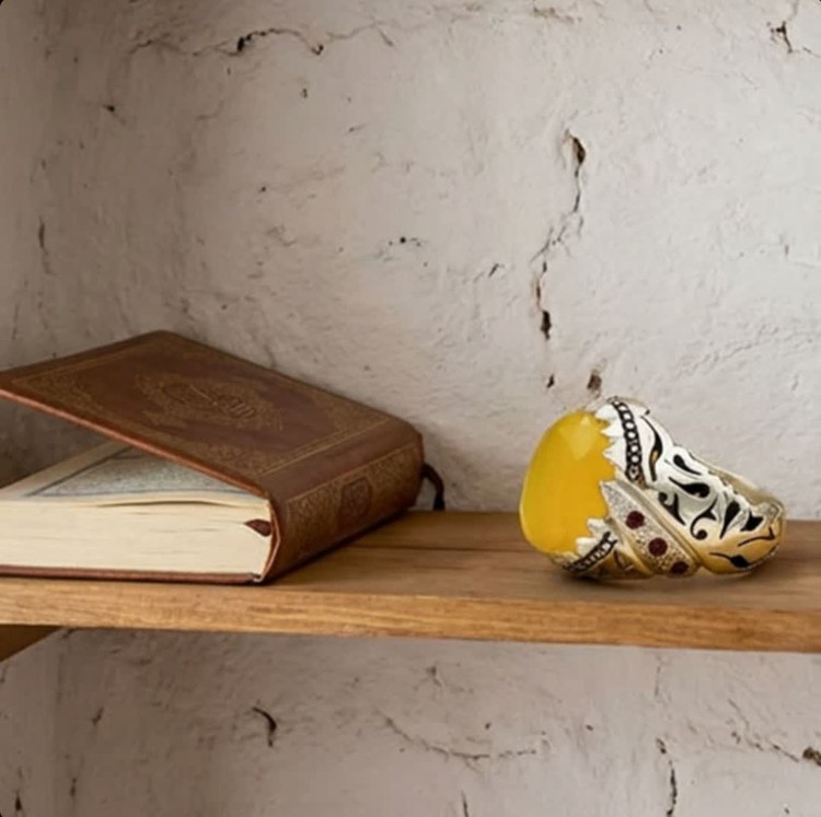 رکاب این محصول دستساز است که به خوبی میتوان در آن هنر دست هنرمندان مجرب این حرفه را مشاهده کرد. در کنار مخراجکاری، شبکه زیبایی کار شده که این محصول را به انگشتری چشمنواز تبدیل کرده است. نگین استفاده شده در این محصول شرف الشمس اصل و معدنی میباشد که با تراش الماسی درخشش و جلوه متمایزی دارد. این نگین ارزشمند علاوهبر زیبایی ظاهری دارای خواص معنوی بسیار زیاد (حکاکی دعای پر فضیلت شرف شمس در پشت نگین با آداب معین و در زمان خاص) نیز میباشد.