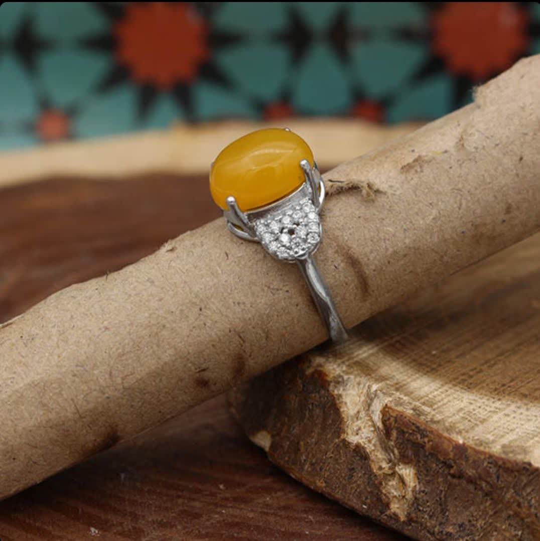 ترکیبی از طراحی مدرن و اصالت کلاسیک در این انگشتر شرف الشمس، آن را به انتخابی متفاوت تبدیل کرده است. نگین عقیق زرد طبیعی، در کنار دعای شرف الشمس، معنایی خاص به این جواهر بخشیده است (حکاکی ذکر پر فضیلت شرف شمس در پشت نگین با آداب معین و در زمان خاص). نقره 925، کیفیت بالا و دوام طولانی این محصول را تضمین میکند. همچنین، آبکاری طلا سفید، از کدر شدن و تغییر رنگ نقره جلوگیری کرده و درخشندگی آن را حفظ میکند. نگینهای اتمی درخشان، ظاهری خیرهکننده و چشمنواز به انگشتر دادهاند. قابلیت تغییر سایز نیز باعث شده تا این انگشتر برای هر دستی مناسب باشد. از جمله ویژگیهای مهم این محصول میتوان به چنگهای محکم این انگشتر اشاره کرد که به محکمی سنگ عقیق را دربر گرفتهاند.