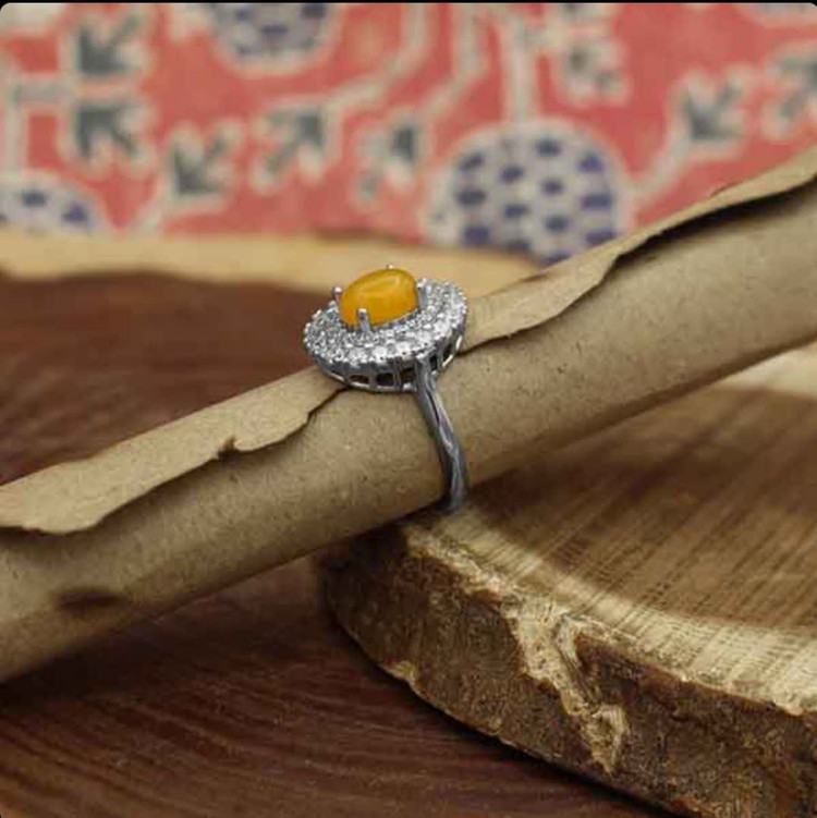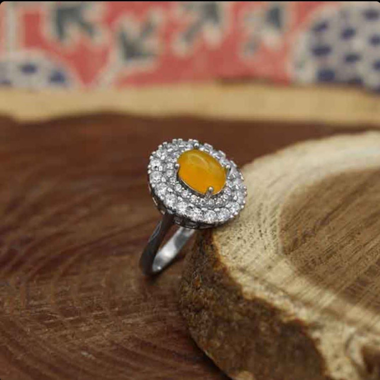 این انگشتر از جنس نقره با عیار 925 ساخته و طراحی شده است. بر دور فریم 2 لایه نگین اتمی مشاهده میشود. لایه ای از نگینهای درشت و لایه دیگر با نگینهای ریز که جلوهای خاص به انگشتر بخشیده است. در مرکز این نگینها نیز نگین اصلی انگشتر یعنی عقیق زرد قرار گرفته. عقیق از جمله نگینهایی است که استفاده از آن بارها توسط ائمه و معصومین (ع) توصیه شده است، مخصوصا اگر با اذکار خاصی مانند شرف الشمس همراه شود (حکاکی ذکر پر فضیلت شرف شمس در پشت نگین زرد با آداب و در زمان مخصوص). ضمناً این محصول دارای آبکاری طلا سفید میباشد.