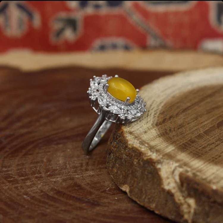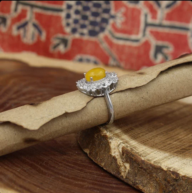 طراحی فریم این انگشتر همانطور که مشاهده میشود شباهت بالایی به گل دارد. گلبرگهای این گل با نگینهای اتمی سوئیسی مزین شده و جلوهای جذاب و درخشان به آن داده است. بدنه این گل از جنس نقره با عیار 925 بوده و همچنین آبکاری طلاسفید جهت حفظ رنگ نقره و جلای بیشتر انگشتر انجام شده است. نگین زردرنگی که بر روی این محصول قرار گرفته از جنس عقیق زرد طبیعی است (حکاکی ذکر پر فضیلت شرف شمس در پشت نگین زرد با آداب و در زمان مخصوص). این انگشتر قابلیت سایز شدن نیز دارد
