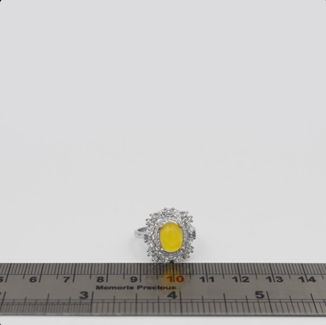 طراحی فریم این انگشتر همانطور که مشاهده میشود شباهت بالایی به گل دارد. گلبرگهای این گل با نگینهای اتمی سوئیسی مزین شده و جلوهای جذاب و درخشان به آن داده است. بدنه این گل از جنس نقره با عیار 925 بوده و همچنین آبکاری طلاسفید جهت حفظ رنگ نقره و جلای بیشتر انگشتر انجام شده است. نگین زردرنگی که بر روی این محصول قرار گرفته از جنس عقیق زرد طبیعی است (حکاکی ذکر پر فضیلت شرف شمس در پشت نگین زرد با آداب و در زمان مخصوص). این انگشتر قابلیت سایز شدن نیز دارد