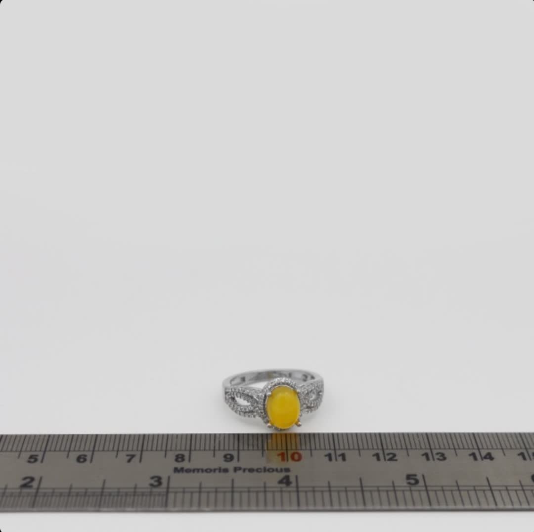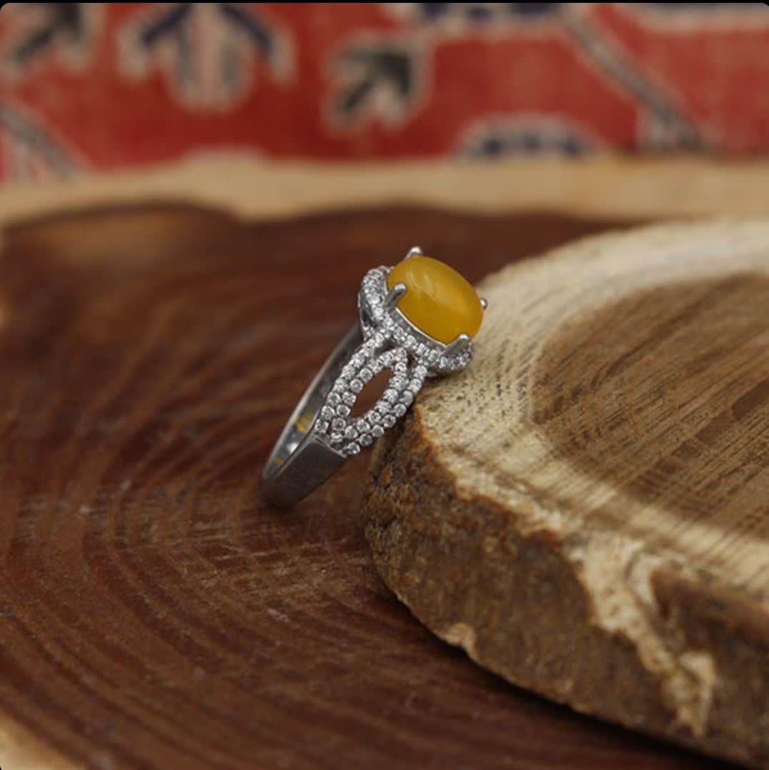 این انگشتر از نقره با عیار 925 ساخته و طراحی شده است. نگینهای ریز و براقی که دور فریم مشاهده میشود، نگینهای اتمی سوئیسی است که جهت افزایش درخشندگی و زیبایی به انگشتر افزوده شده اند. نگین اصلی انگشتر نیز عقیق زرد طبیعی است (حکاکی ذکر پر فضیلت شرف شمس در پشت نگین زرد با آداب و در زمان مخصوص). این محصول با آبکاری طلا سفید جلا داده شده و همچنین امکان تغییر سایز برای آن وجود دارد.