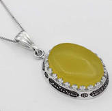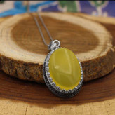 این گردنبند با طراحی ساده، گزینهای ایدهآل برای سلیقههای مختلف محسوب میشود و هم برای خانمها و هم آقایان مناسب است. فریم آن از نقره با عیار ۹۲۵ ساخته شده و ابعاد گردنبند همراه با نگین عقیق زرد در تصاویر قابل مشاهده است. در اطراف نگین قسمتی از آیه شریفه آیه الکرسی (اَللَّـهُ لَا إِلَـٰهَ إِلَّا هُوَ الْحَيُّ الْقَيُّومُ ۚ لَا تَأْخُذُهُ سِنَةٌ وَلَا نَوْمٌ ۚ لَّهُ مَا فِي السَّمَاوَاتِ وَمَا فِي الْأَرْضِ) به چشم میخورد. این فریم با استحکام بالا، نگین را در بر گرفته و در قسمت بالایی، یک آویز نقرهای متصل شده که ارتباط محکمی بین زنجیر و گردنبند ایجاد میکند. نگین این گردنبند، عقیق زرد اصل و معدنی است که در متون اسلامی خواص متعددی برای آن ذکر شده است. (حکاکی ذکر پر فضیلت شرف الشمس در پشت نگین زرد رنگ با آداب خاص و در زمان خاص آن). لازم به ذکر است که قیمت این محصول بدون در نظر گرفتن زنجیر نمایش دادهشده در تصویر محاسبه شده است.