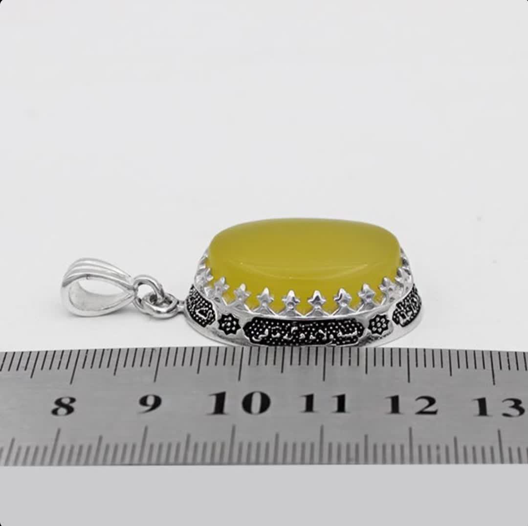 این گردنبند با طراحی ساده، گزینهای ایدهآل برای سلیقههای مختلف محسوب میشود و هم برای خانمها و هم آقایان مناسب است. فریم آن از نقره با عیار ۹۲۵ ساخته شده و ابعاد گردنبند همراه با نگین عقیق زرد در تصاویر قابل مشاهده است. در اطراف نگین قسمتی از آیه شریفه آیه الکرسی (اَللَّـهُ لَا إِلَـٰهَ إِلَّا هُوَ الْحَيُّ الْقَيُّومُ ۚ لَا تَأْخُذُهُ سِنَةٌ وَلَا نَوْمٌ ۚ لَّهُ مَا فِي السَّمَاوَاتِ وَمَا فِي الْأَرْضِ) به چشم میخورد. این فریم با استحکام بالا، نگین را در بر گرفته و در قسمت بالایی، یک آویز نقرهای متصل شده که ارتباط محکمی بین زنجیر و گردنبند ایجاد میکند. نگین این گردنبند، عقیق زرد اصل و معدنی است که در متون اسلامی خواص متعددی برای آن ذکر شده است. (حکاکی ذکر پر فضیلت شرف الشمس در پشت نگین زرد رنگ با آداب خاص و در زمان خاص آن). لازم به ذکر است که قیمت این محصول بدون در نظر گرفتن زنجیر نمایش دادهشده در تصویر محاسبه شده است.