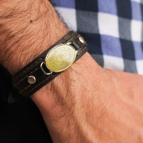 دستبند شرف الشمس چرمی دولایه طرح آیت الکرسی و حرز امام جواد (ع)، یکی از محصولات ساده و در عین حال شیک است که ارزش معنوی بالایی دارد. بر روی این نگین حکاکی “حرز صغیر امام جواد (ع)” به صورت لیزری و با کیفیت بسیار خوبی انجام شده و دور تا دور حرز “آیت الکرسی” حک شده است. ظرافت حکاکی این دو فراز از قرآن و روایات ائمه بسیار مناسب است و زیبایی هنری خاصی به این دستبند داده است. چرم استفاده شده در این محصول چرم طبیعی و به رنگ مشکی براق است. در این محصول از دو لایه چرم طبیعی با کیفیت استفاده شده که مدلی خاص اما ساده است. نگین این محصول عقیق شرف شمس اصل و معدنی است که رنگ زرد مناسبی دارد و طبق کتب معتبر دارای خواص بی شماری است (حکاکی ذکر با برکت شرف شمس پشت نگین در زمان مقرر و با آداب خاص). جنس فریم دستبند از نقره اصل با عیار ۹۲۵ است که استحکام و دوام مناسبی دارد و با دو بند چرمی محکم به دستبند متصل شده است. این فریم دست ساز است و به دست یکی از هنرمندان نقره ساز مشهدی ساخته شده است. کیفیت ساخت فریم مناسب ارزیابی می شود و به صورت کاملا محکم سنگ عقیق را دربرگرفته است. این دستبند مشابه ساعت بوده و برای هر سایز مچی مناسب است.