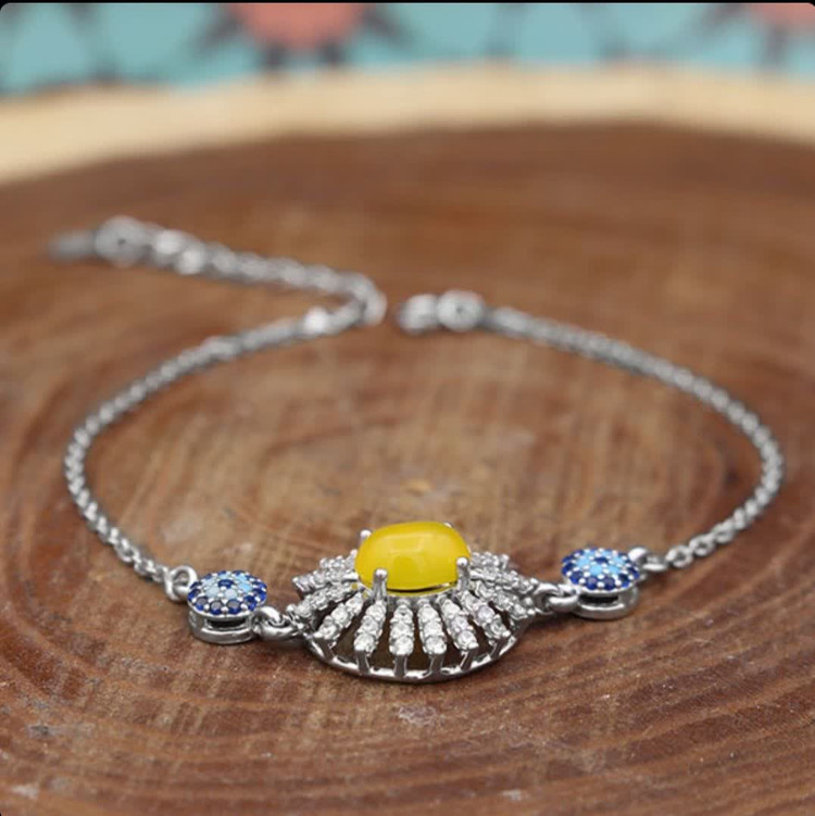 این دستبند نقرهای با نگین عقیق زرد معدنی و دعای شرف الشمس، هدیهای خاص با خواص معنوی فروان است (حکاکی ذکر پر فضیلت شرف شمس در پشت نگین با آداب معین و در زمان خاص). طراحی ظریف و وجود نگینهای اتمی آبی و سورمهای در اطراف عقیق زرد، به آن جلوهای فاخر و دلنشین داده است. آبکاری طلا سفید، ماندگاری و درخشندگی همیشگی را تضمین میکند. اگر به دنبال جواهری با اصالت و خواص مفید هستید، این دستبند انتخابی درست برای شما خواهد بود. جنس این دستبند از نقره با عیار 925 است. حلقههای دستبند به محکمی به یک دیگر متصل شدهاند و به آسانی از هم جدا نخواهند شد. نگینهای باگت خوشهای در اطراف نگین عقیق زرد نیز همچون الماسی میدرخشند.