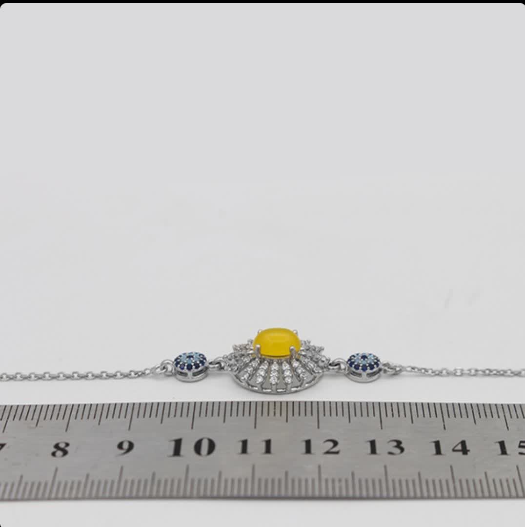 این دستبند نقرهای با نگین عقیق زرد معدنی و دعای شرف الشمس، هدیهای خاص با خواص معنوی فروان است (حکاکی ذکر پر فضیلت شرف شمس در پشت نگین با آداب معین و در زمان خاص). طراحی ظریف و وجود نگینهای اتمی آبی و سورمهای در اطراف عقیق زرد، به آن جلوهای فاخر و دلنشین داده است. آبکاری طلا سفید، ماندگاری و درخشندگی همیشگی را تضمین میکند. اگر به دنبال جواهری با اصالت و خواص مفید هستید، این دستبند انتخابی درست برای شما خواهد بود. جنس این دستبند از نقره با عیار 925 است. حلقههای دستبند به محکمی به یک دیگر متصل شدهاند و به آسانی از هم جدا نخواهند شد. نگینهای باگت خوشهای در اطراف نگین عقیق زرد نیز همچون الماسی میدرخشند.
