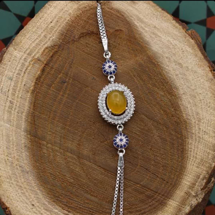 دستبند شرف الشمس مدل سوگند از نقره با عیار ۹۲۵ ساخته شده و با نگینهای ریز اتمی درخشان تزئین شده است. طراحی ظریف و استفاده از نگینهای اتمی آبی در اطراف عقیق زرد، زیبایی و جلوهای خاص به آن بخشیده است. آبکاری رادیوم روی این محصول، علاوه بر افزایش جذابیت و درخشش، مانع از تیرگی و تغییر رنگ آن میشود و جلوه نقره را حفظ میکند. نگین این دستبند از عقیق زرد معدنی و اصل میباشد. (حکاکی ذکر پر فضیلت شرف شمس در پشت نگین زرد با آداب و در زمان مخصوص). این سنگ ارزشمند، خواص فراوانی داشته و در روایات ائمه معصومین (ع) مورد تأکید قرار گرفته است. علاوه بر این، قفل محکم و بادوام دستبند، ایمنی بالایی را فراهم کرده و طراحی ظریف آن، جلوهای فانتزی و چشمنواز به آن بخشیده است