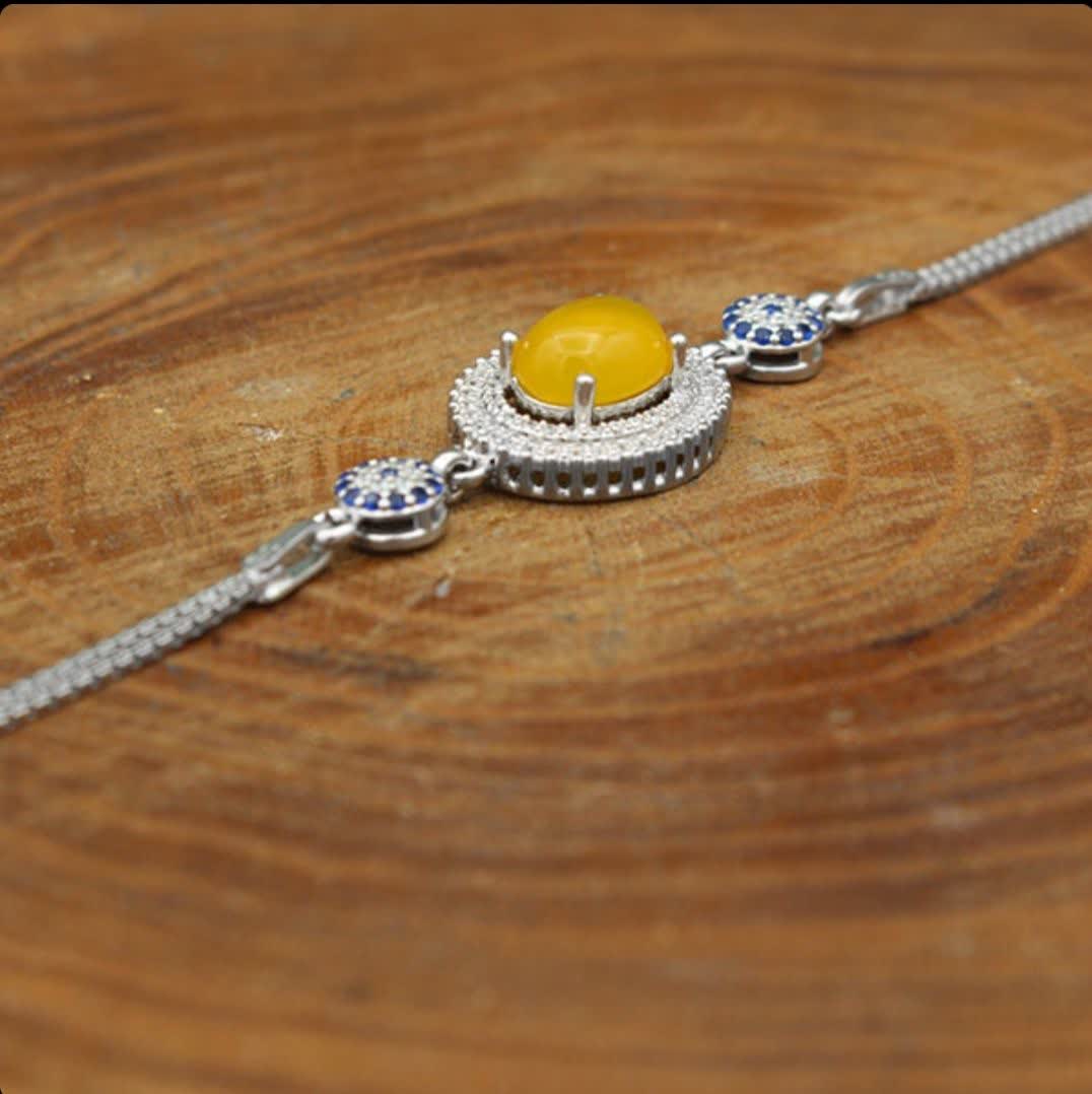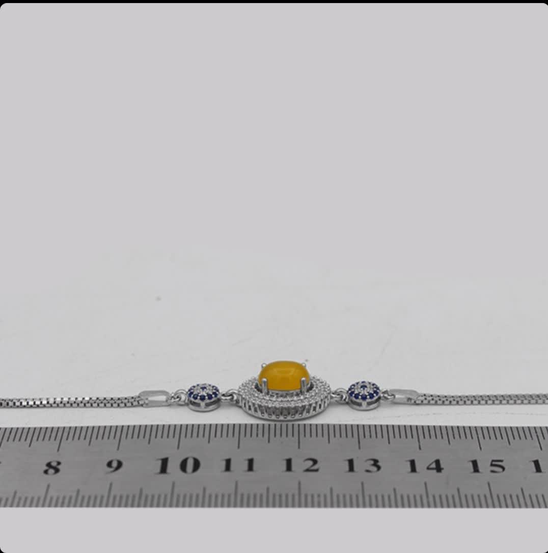 دستبند شرف الشمس مدل سوگند از نقره با عیار ۹۲۵ ساخته شده و با نگینهای ریز اتمی درخشان تزئین شده است. طراحی ظریف و استفاده از نگینهای اتمی آبی در اطراف عقیق زرد، زیبایی و جلوهای خاص به آن بخشیده است. آبکاری رادیوم روی این محصول، علاوه بر افزایش جذابیت و درخشش، مانع از تیرگی و تغییر رنگ آن میشود و جلوه نقره را حفظ میکند. نگین این دستبند از عقیق زرد معدنی و اصل میباشد. (حکاکی ذکر پر فضیلت شرف شمس در پشت نگین زرد با آداب و در زمان مخصوص). این سنگ ارزشمند، خواص فراوانی داشته و در روایات ائمه معصومین (ع) مورد تأکید قرار گرفته است. علاوه بر این، قفل محکم و بادوام دستبند، ایمنی بالایی را فراهم کرده و طراحی ظریف آن، جلوهای فانتزی و چشمنواز به آن بخشیده است