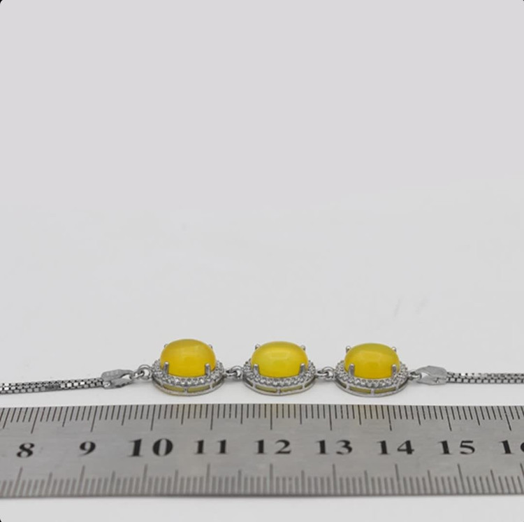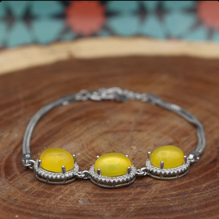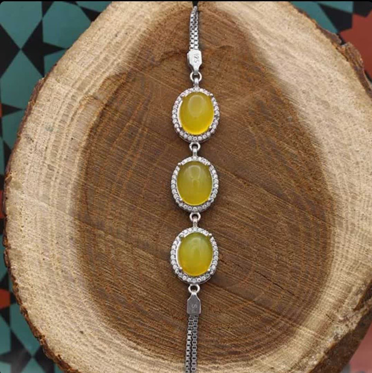 این دستبند ظریف و منحصربهفرد از نقره با عیار ۹۲۵ ساخته شده و سه نگین عقیق زرد معدنی را در دل خود جای داده است. طراحی زیبا و هنرمندانه این دستبند، جلوهای خاص به دستان شما میبخشد. آبکاری طلا سفیدبهکاررفته در آن، از کدر شدن جلوگیری کرده و درخشندگی دائمی را تضمین میکند. در کنار این ویژگیها، وجود نگینهای اتمی ظریف اطراف عقیق زرد، به زیبایی این جواهر ارزشمند افزوده و آن را به انتخابی فوقالعاده برای بانوان خوشسلیقه تبدیل کرده است. این دستبند دارای نگینهای عقیق بزرگتری در مقایسه با سایر دستبندهای شرف الشمس است. جنس نگین ها از عقیق شرف الشمس اصل است که خواص معنوی زیادی دارد (حکاکی ذکر پر فضیلت شرف شمس در پشت نگین با آداب معین و در زمان خاص).