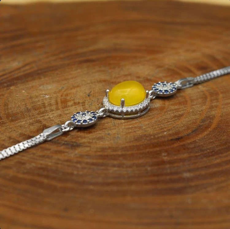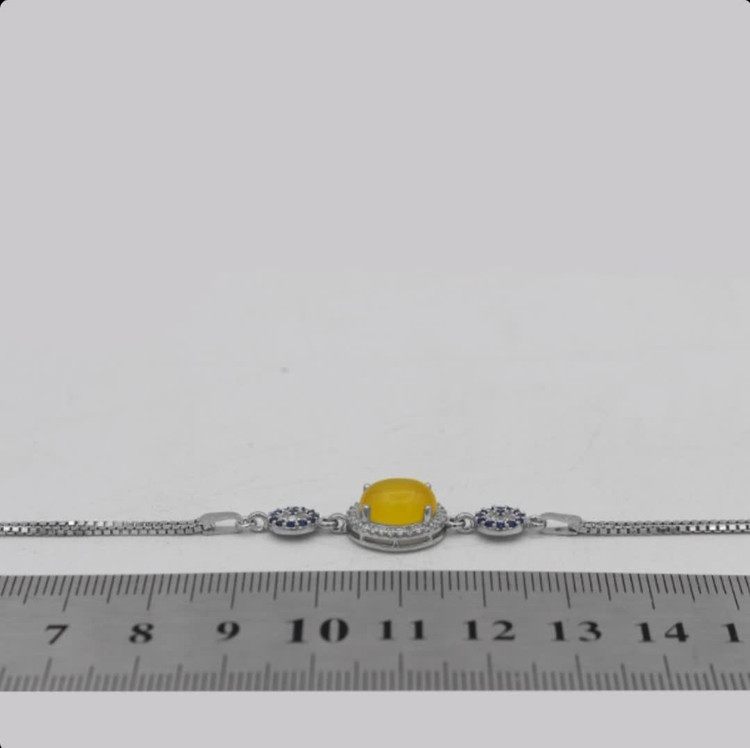 طرح مینو، یکی از جذابترین دستبندهاست که شامل دو نوع نگین اتمی است. نگینهای اتمی ریزی که دور عقیق زرد قرار گرفته اند و نگینهای اتمی رنگی در دو طرف دستبند. نقره بکار رفته در ساخت این دستبند با عیار 925 بوده که آبکاری طلاسفید روی آن انجام شده است. همانطورکه گفتیم نگین اصلی این دستبند عقیق زرد معدنی است (حکاکی ذکر پر فضیلت شرف شمس در پشت نگین با آداب معین و در زمان خاص)
