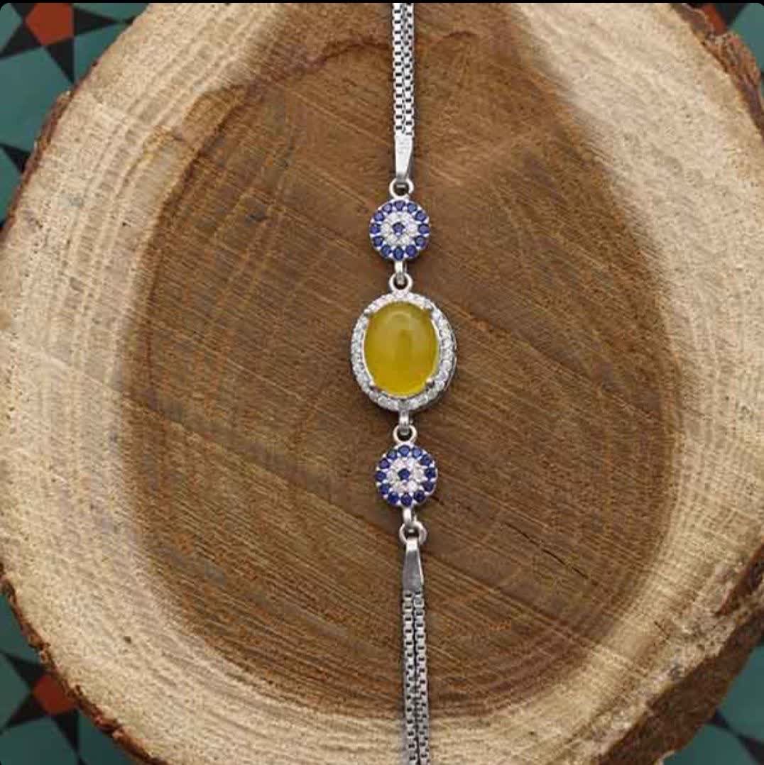 طرح مینو، یکی از جذابترین دستبندهاست که شامل دو نوع نگین اتمی است. نگینهای اتمی ریزی که دور عقیق زرد قرار گرفته اند و نگینهای اتمی رنگی در دو طرف دستبند. نقره بکار رفته در ساخت این دستبند با عیار 925 بوده که آبکاری طلاسفید روی آن انجام شده است. همانطورکه گفتیم نگین اصلی این دستبند عقیق زرد معدنی است (حکاکی ذکر پر فضیلت شرف شمس در پشت نگین با آداب معین و در زمان خاص)