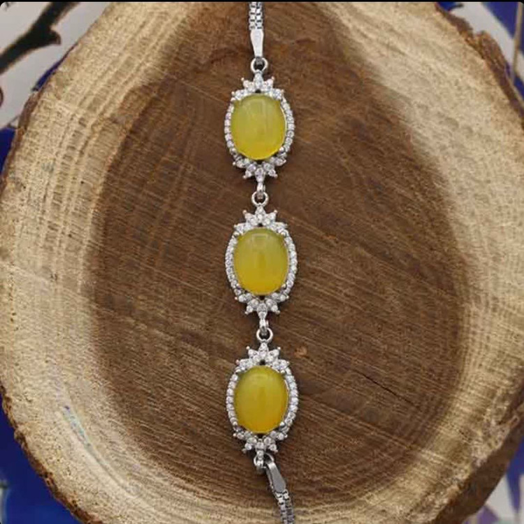 3 نگین عقیق زرد معدنی به همراه تعداد زیادی نگین اتمی، کافی است تا طرحی جذاب بر روی دستبند ایجاد کنند. نقره بکار رفته در این دستبند با عیار 925 بوده و علاوه بر زیبایی و ظرافت از استحکام خوبی برخوردار است. نقره با گذشت زمان کمی دچار تغییر رنگ میشود اما روی این دستبند آبکاری طلا سفید انجام شده تا از به روز این مشکل جلوگیری شود. این آبکاری در افزایش جلای محصول نیز تأثیرگذار است (حکاکی ذکر پر فضیلت شرف شمس در پشت نگین زرد با آداب و در زمان مخصوص).
