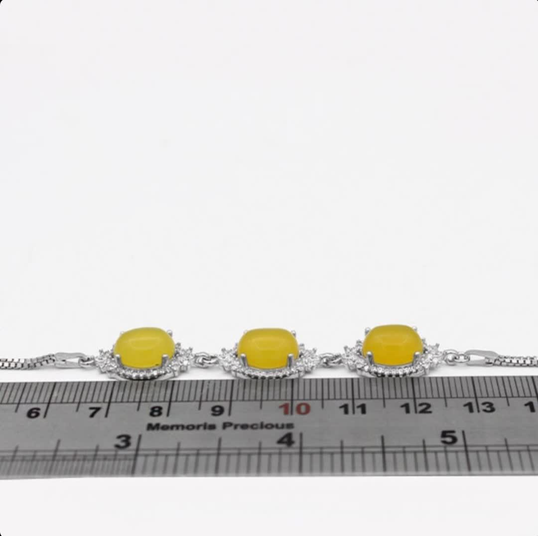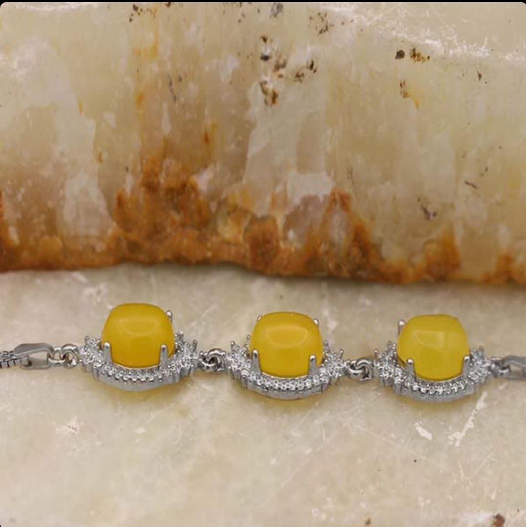3 نگین عقیق زرد معدنی به همراه تعداد زیادی نگین اتمی، کافی است تا طرحی جذاب بر روی دستبند ایجاد کنند. نقره بکار رفته در این دستبند با عیار 925 بوده و علاوه بر زیبایی و ظرافت از استحکام خوبی برخوردار است. نقره با گذشت زمان کمی دچار تغییر رنگ میشود اما روی این دستبند آبکاری طلا سفید انجام شده تا از به روز این مشکل جلوگیری شود. این آبکاری در افزایش جلای محصول نیز تأثیرگذار است (حکاکی ذکر پر فضیلت شرف شمس در پشت نگین زرد با آداب و در زمان مخصوص).