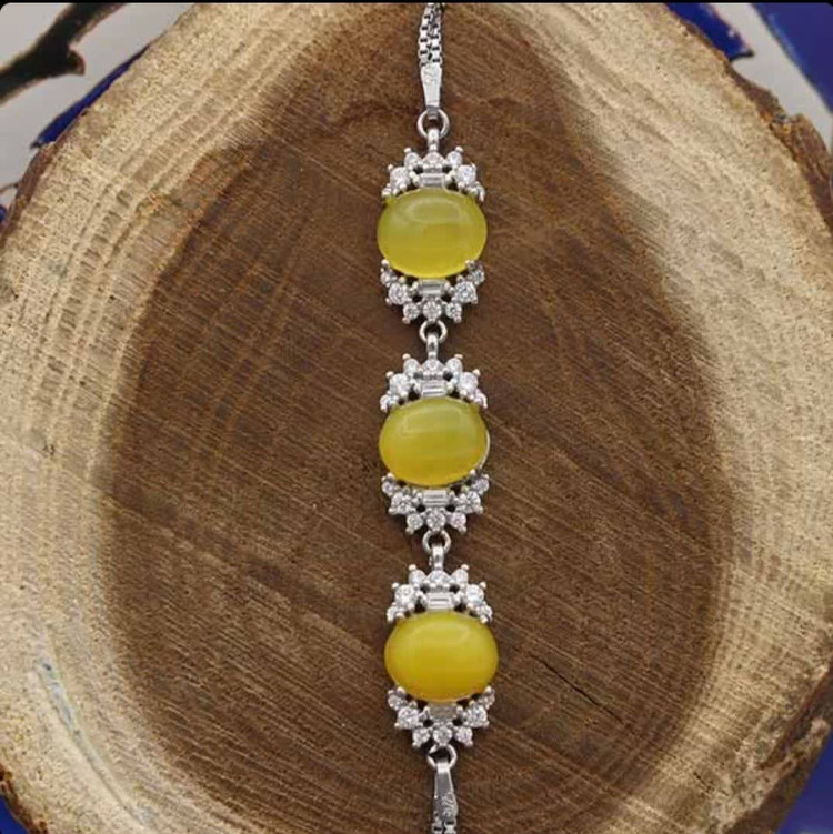 یکی از جذاب ترین دستبندهای موجود بر روی وبسایت، طرح الیزا است. این محصول از نقره با عیار 925 ساخته شده است و از استحکام خوبی برخوردار است. 3 نگین عقیق زرد معدنی بر روی دستبند کار شده و امکان حکاکی نیز بر آن ها وجود دارد (حکاکی ذکر پر فضیلت شرف شمس در پشت نگین زرد با آداب و در زمان مخصوص). آبکاری طلاسفید به همراه نگینهای اتمی در اطراف دستبند جلوهای بی نظیر به آن داده است و چشم هر بینندهای را مجذوب خود میکند. این آبکاری از تغییر رنگ نقره نیز جلوگیری میکند