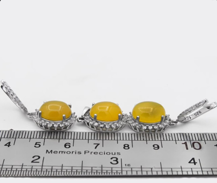نیم ست معینا طرحی ظریف و پر کار است. بر روی گشواره های این محصول تعداد بالایی نگین های اتمی وجود دارد. ابعاد سنگ های عقیق این محصول در مقایسه با سایر نیم ست ها بزرگتر میباشد. جنس نیم ست از نقره با عیار ۹۲۵ بوده و دارای آبکاری رادیوم میباشد. آبکاری رادیوم از کدر شدن و تغییر رنگ نقره جلوگیری میکند. سنگ های نیم ست از جنس عقیق زرد اصلی و معدنی میباشند که دارای ذکر شرف شمس (حکاکی ذکر پر فضیلت شرف شمس در پشت نگین زرد با آداب و در زمان مخصوص) می باشند.