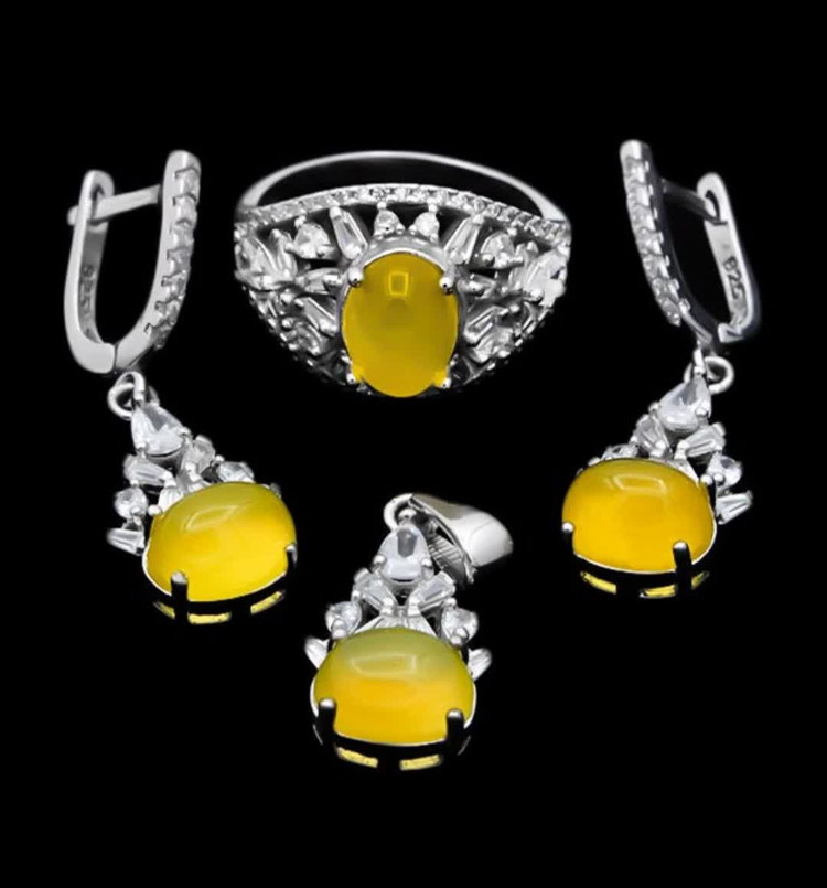 نیم ست شرف الشمس نقره طرح مریده از نقره ای با عیار ۹۲۵ ساخته شده است. این محصول دارای یک لایه آبکاری رادیوم می باشد که مانع تیرگی محصول در استفاده طولانی مدت می شود. بر روی این نیم ست نگین های ریز اتمی قرار داده شده است که درخشش محصول را افزایش داده است. چیدمان نگین های اتمی این محصول زیبا و مدرن انجام شده است و طراحی آن را از سایر محصولات متمایز کرده است. جنس نگین این محصول سنگ شرف الشمس اصل و طبیعی می باشد که خواص بسیاری دارد (حکاکی ذکر پر فضیلت شرف شمس در پشت نگین زرد با آداب و در زمان مخصوص). انگشتر این نیم سات قابلیت تغییر سایز را دارد.