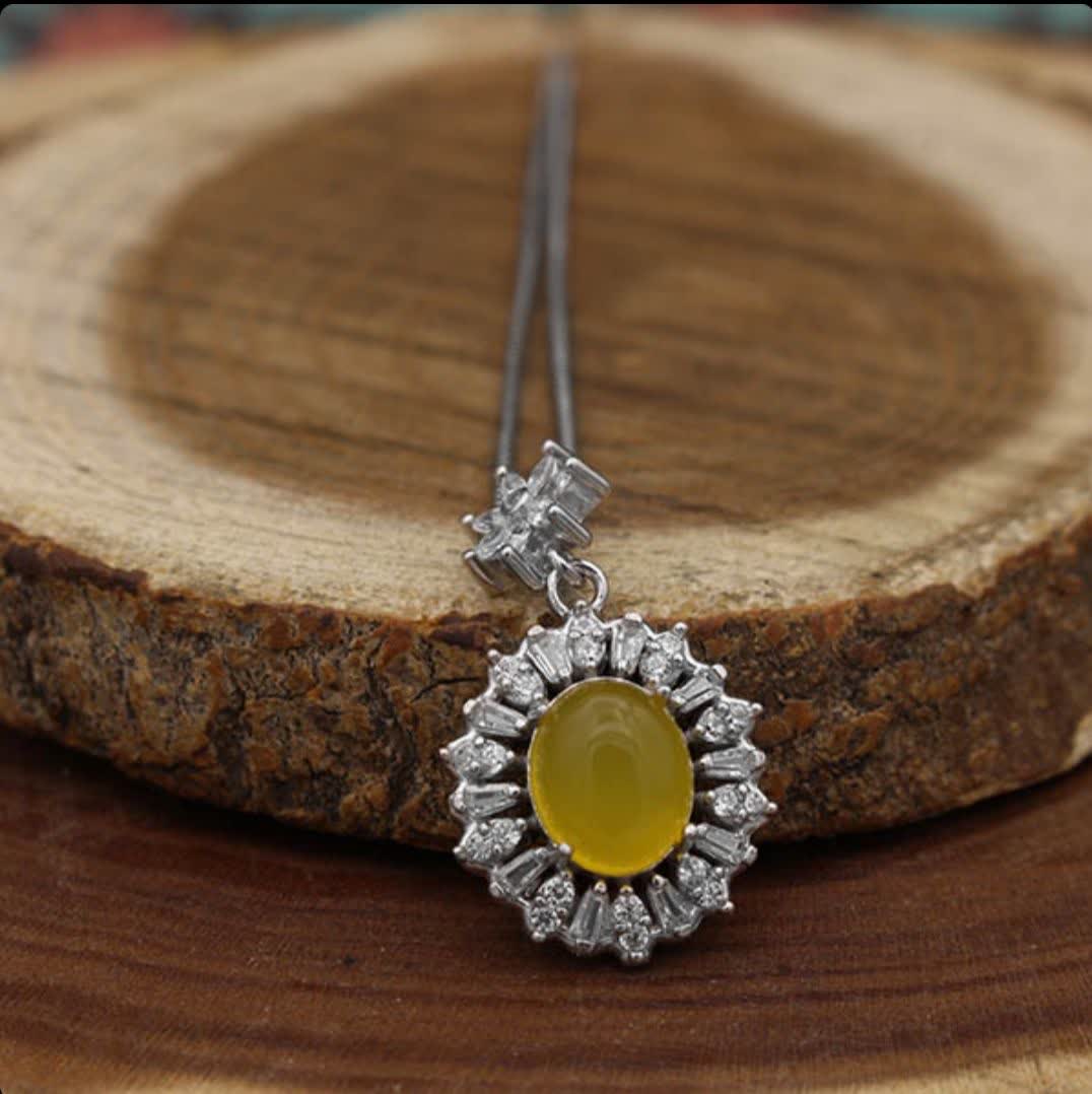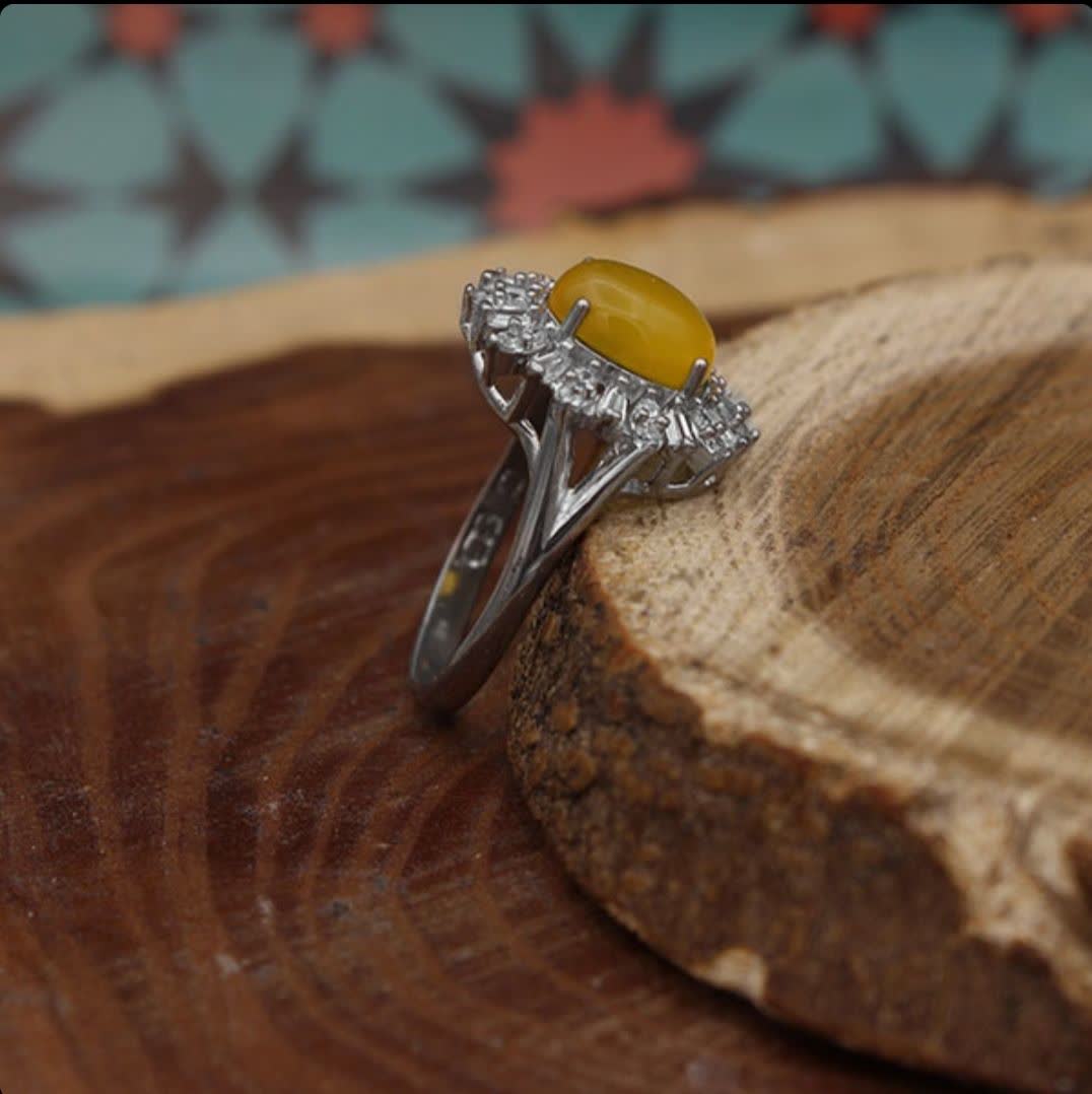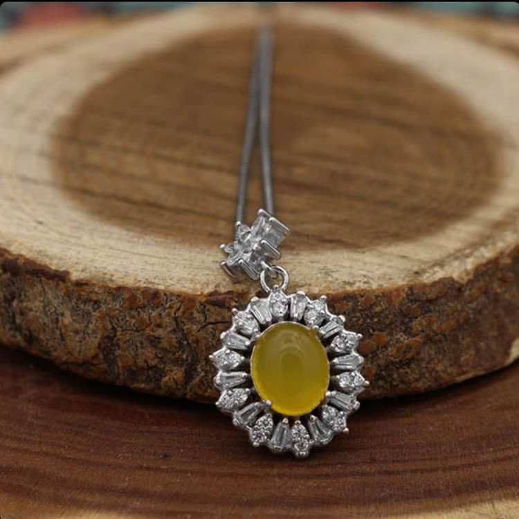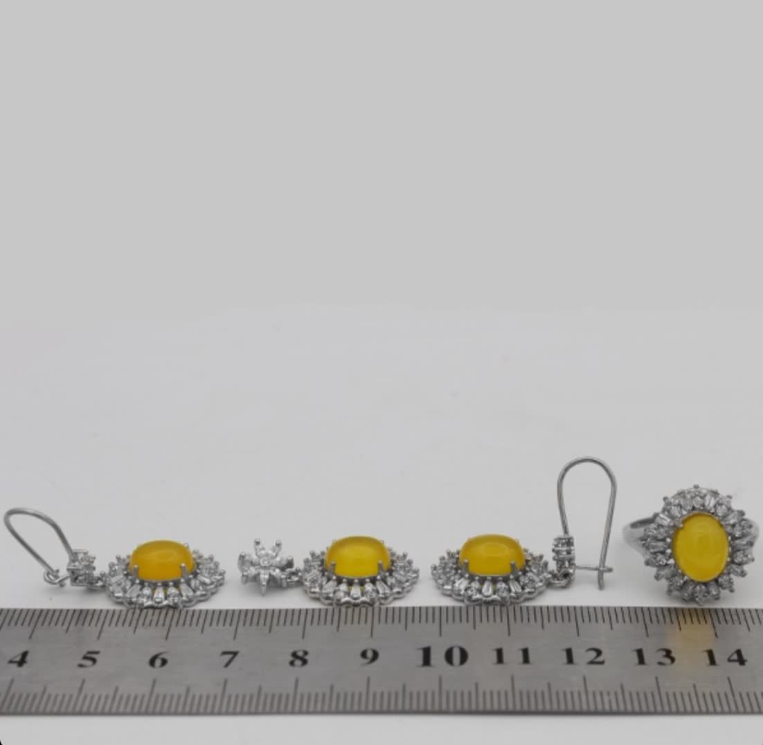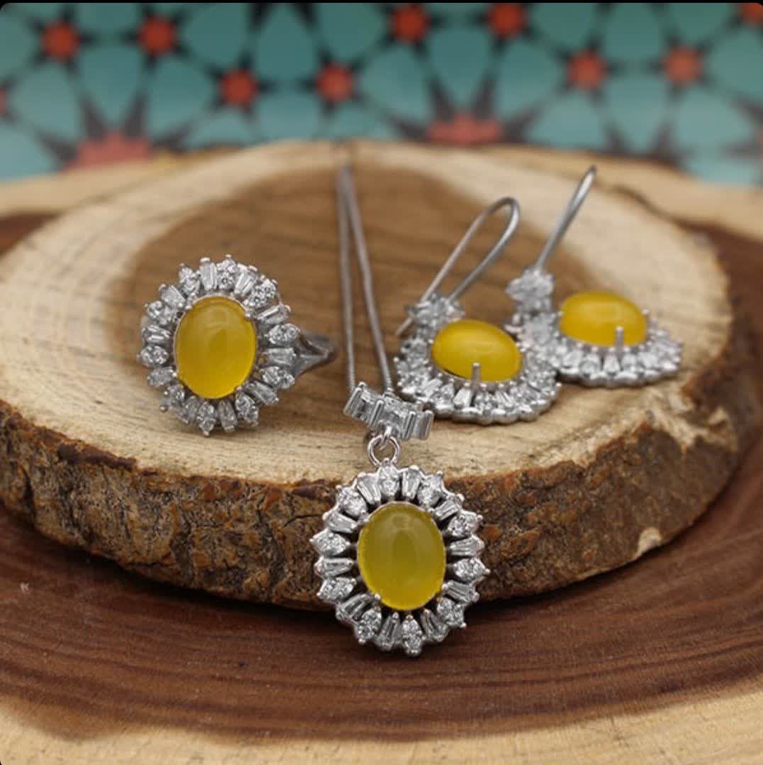 عقیق زرد، با انعکاس رنگی زرد و دلنشین، حس گرما و آرامش را به شما هدیه میدهد. حکاکی شرفالشمس بر روی این سنگ، افزایش رزق و روزی و برکت را به زندگیتان جاری میکند (حکاکی ذکر پر فضیلت شرف شمس در پشت نگین با آداب معین و در زمان خاص). طراحی شیک و مدرن، در کنار آبکاری طلا سفید، این نیمست را به جواهری خاص و درخشان تبدیل کرده است. نیم ست شرف الشمس زنانه طرح ستاره دارای تعداد زیادی از نگینهای اتمی است. گوشوارههای این نیمست از نوع میخی نبوده و بصورت حلقهای در داخل گوش قرار میگیرد. این نیم ست دارای یک انگشتر، یک گردنبند و دو عدد گوشواره است. جنس تمامی اقلام موجود در این نیمست از نقره با عیار 925 به همراه آبکاری طلا سفید است. آبکاری طلا سفید از کدر شدن نیم ست جلوگیری کرده و سبب درخشش آن میگردد. لازم به ذکر است که انگشتر این نیمست قابلیت سایز شدن برای هر سایز انگشتی را دارد.