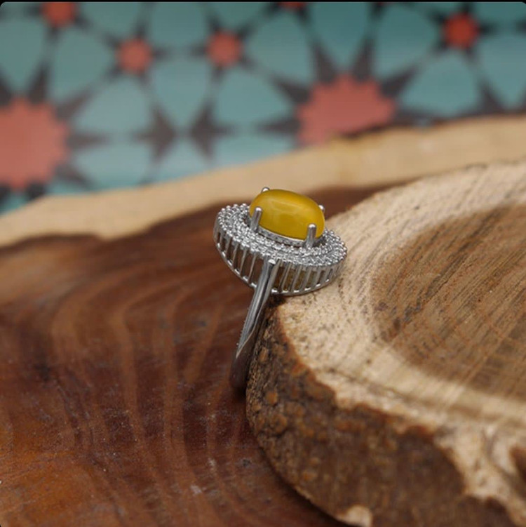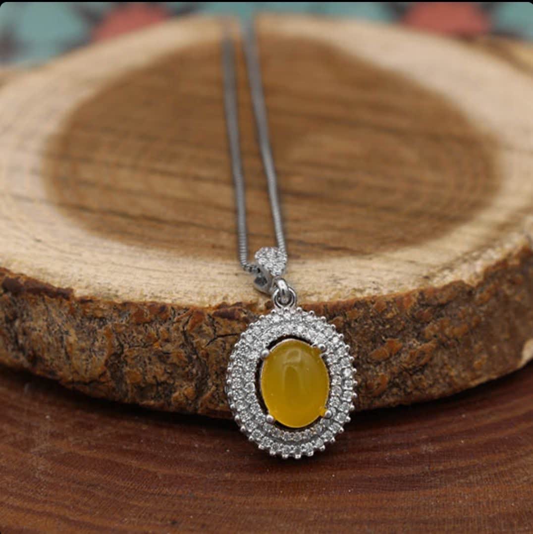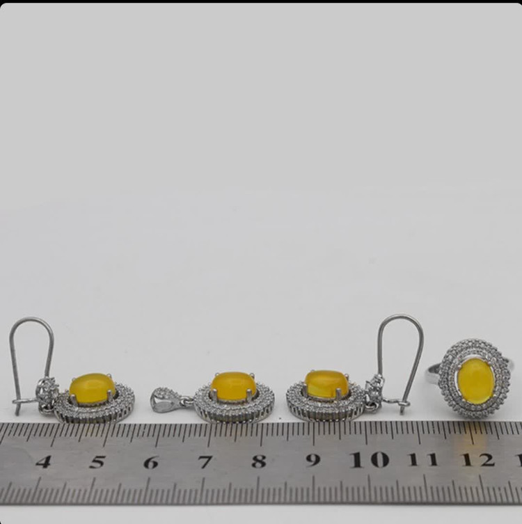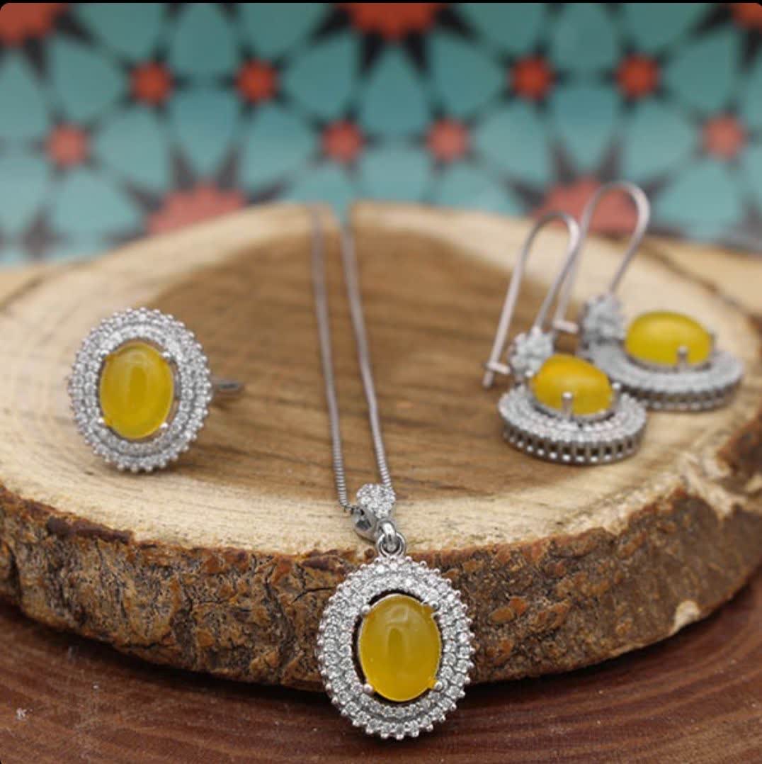 سنگهای عقیق زرد، با دعای متبرک شرفالشمس، جذابیت و معنویت را یکجا در خود دارند (حکاکی ذکر پر فضیلت شرف شمس در پشت نگین با آداب معین و در زمان خاص). طراحی ظریف گوشوارهها و گردنبند، در کنار انگشتری که برای هر سایز قابل تنظیم است، این مجموعه را به انتخابی کامل تبدیل کرده است. نیم ست شرف الشمس زنانه طرح هلن دارای تعداد زیادی از نگینهای اتمی است. گوشوارههای این نیمست از نوع میخی نبوده و بصورت حلقهای در داخل گوش قرار میگیرد. این نیم ست دارای یک انگشتر، یک گردنبند و دو عدد گوشواره است. جنس تمامی اقلام موجود در این نیمست از نقره با عیار 925 به همراه آبکاری طلا سفید است. آبکاری طلا سفید از کدر شدن نیم ست جلوگیری کرده و سبب درخشش آن میگردد.
