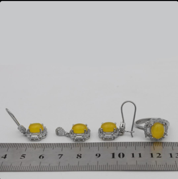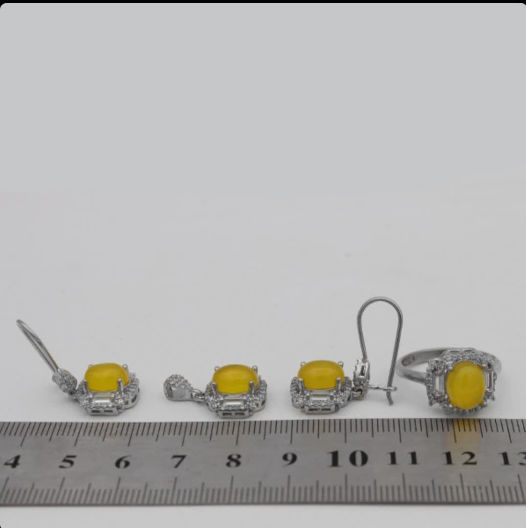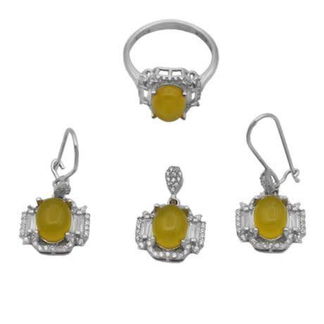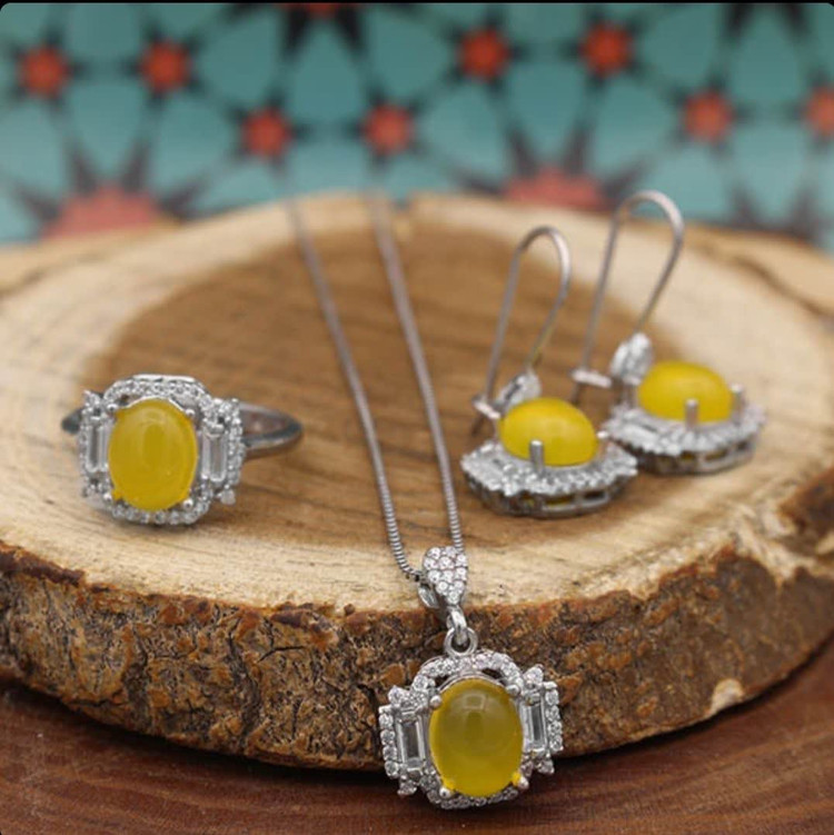 این نیمست فوقالعاده با سنگهای عقیق زرد درخشان، روحی تازه به ظاهر شما میبخشد. دعای شرفالشمس در کنار عقیق زرد اصل، ارزش معنوی این نیم ست را بالا برده است (حکاکی ذکر پر فضیلت شرف شمس در پشت نگین با آداب معین و در زمان خاص). انگشتر قابل سایز است و آبکاری طلا سفید، دوام درخشش و کیفیت این محصول را افزایش داده است. نیم ست شرف الشمس زنانه طرح سوران دارای تعداد زیادی از نگینهای اتمی است. گوشوارههای این نیمست از نوع میخی نبوده و بصورت حلقهای در داخل گوش قرار میگیرد. این نیم ست دارای یک انگشتر، یک گردنبند و دو عدد گوشواره است. جنس تمامی اقلام موجود در این نیمست از نقره با عیار 925 به همراه آبکاری طلا سفید است. آبکاری طلا سفید از کدر شدن نیم ست جلوگیری کرده و سبب درخشش آن میگردد.