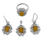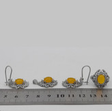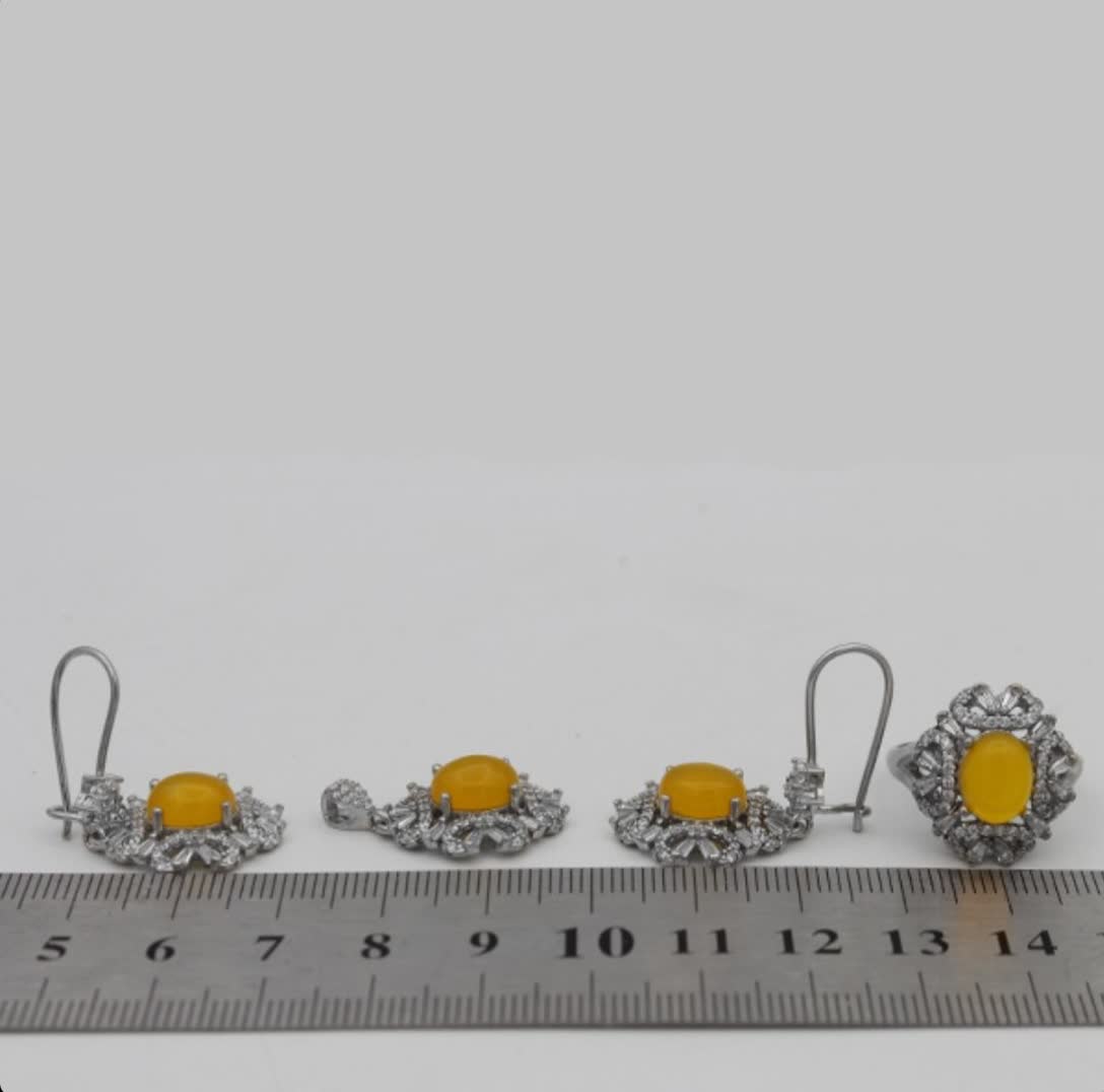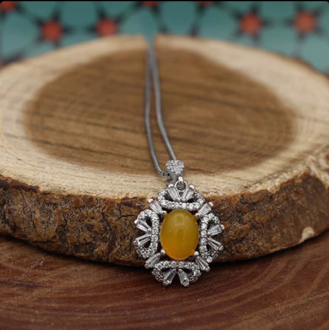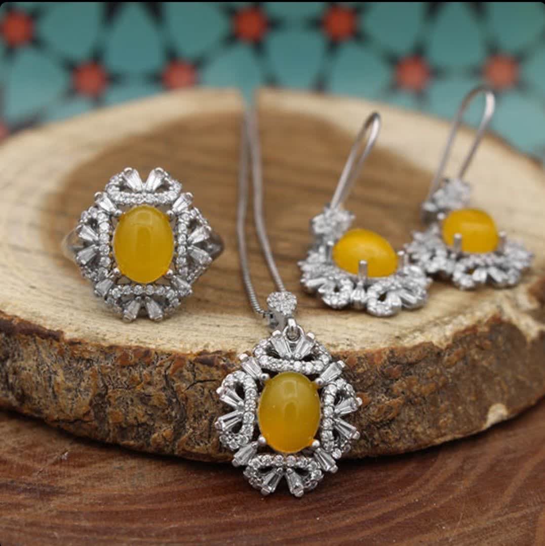 اگر به دنبال جواهری متفاوت و خاص هستید، این نیمست چشمنواز بهترین انتخاب است! سنگهای عقیق زرد که با دعای شرفالشمس مزین شدهاند، خواص بسیار زیاد معنوی را به شما هدیه میدهند (حکاکی ذکر پر فضیلت شرف شمس در پشت نگین با آداب معین و در زمان خاص). نقرهی ۹۲۵ با آبکاری طلا سفید، جلوهای درخشان و ماندگار به این مجموعه داده و قابلیت سایز شدن انگشتر، این محصول را به انتخابی شایسته تبدیل کرده است. نیم ست شرف الشمس زنانه طرح دلارام دارای تعداد زیادی از نگینهای اتمی است. گوشوارههای این نیمست از نوع میخی نبوده و بصورت حلقهای در داخل گوش قرار میگیرد. این نیم ست دارای یک انگشتر، یک گردنبند و دو عدد گوشواره است. جنس تمامی اقلام موجود در این نیمست از نقره با عیار 925 به همراه آبکاری طلا سفید است. آبکاری طلا سفید از کدر شدن نیم ست جلوگیری کرده و سبب درخشش آن میگردد.